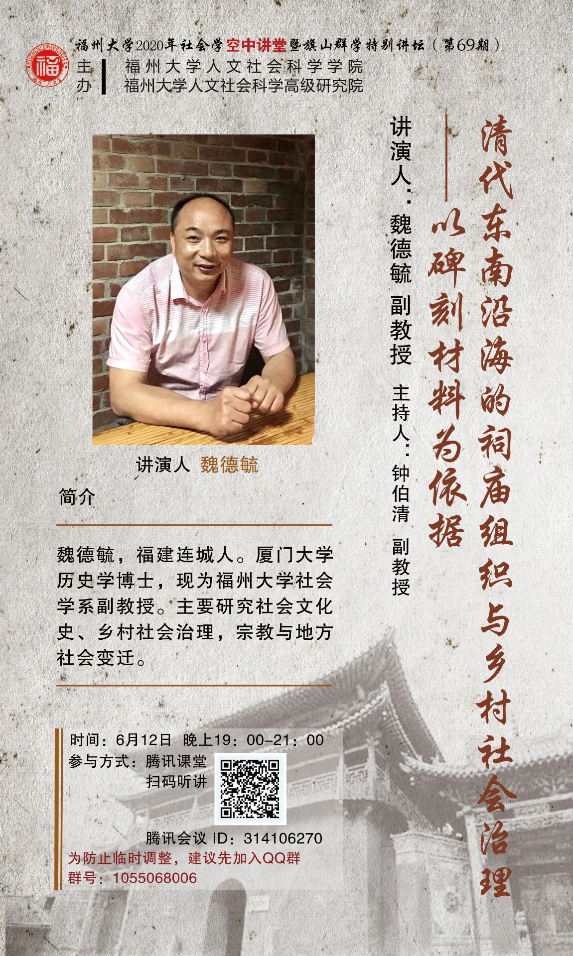 演讲人简介:魏德毓,福建连城人。厦门大学历史学博士,现为87978797威尼斯社会学系副教授。主要研究社会文化史、乡村社会治理,宗教与地方社会变迁。
