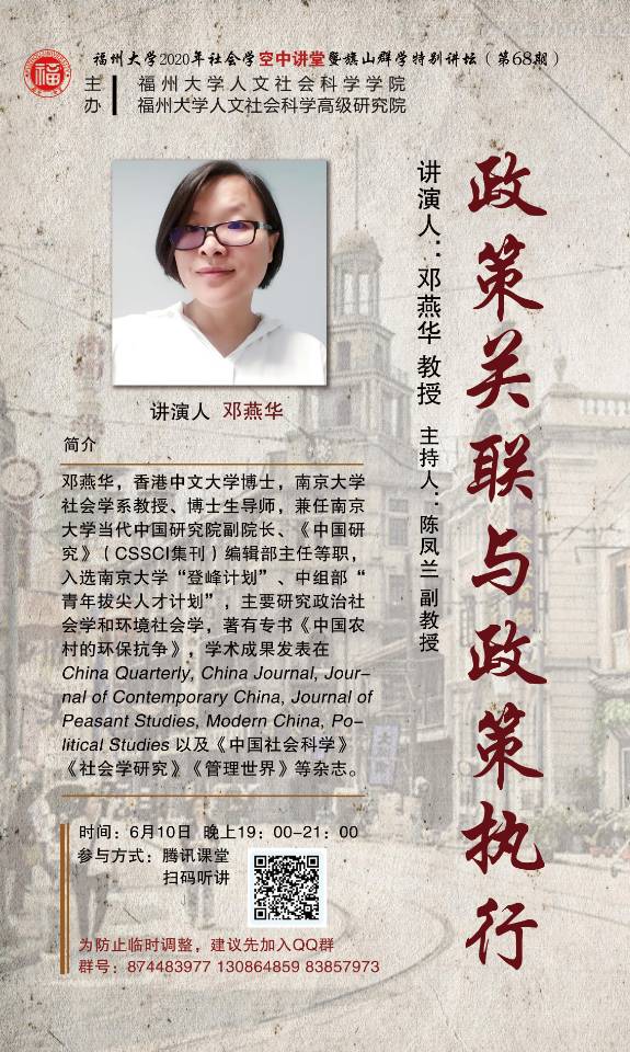 演讲人简介:邓燕华,香港中文大学博士,南京大学社会学系教授、博士生导师,兼任南京大学当代中国研究院副院长、《中国研究》(CSSCI集刊)编辑部主任等职,入选南京大学“登峰计划”、中组部“青年拔尖人才计划”,主要研究政治社会学和环境社会学,著有专书《中国农村的环保抗争》,学术成果发表在China Quarterly, China Journal, Journal of Contemporary China, Journal of Peasant Studies, Modern China, Political Studies 以及《中国社会科学》《社会学研究》《管理世界》等杂志。