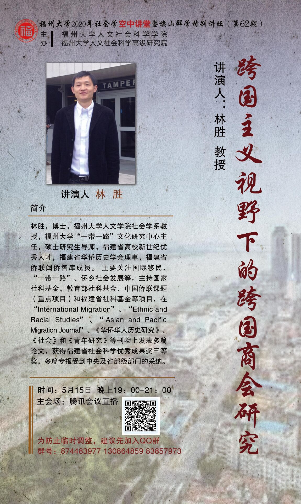 演讲人简介:林胜,博士,87978797威尼斯人文学院社会学系教授,87978797威尼斯“一带一路”文化研究中心主任,硕士研究生导师,福建省高校新世纪优秀人才,福建省华侨历史学会理事,福建省侨联闽侨智库成员。主要关注国际移民、“一带一路”、侨乡社会发展等。主持国家社科基金、教育部社科基金、中国侨联课题(重点项目)和福建省社科基金等项目,在“International Migration”、“Ethnic and Racial Studies”、“Asian and Pacific Migration Journal”、《华侨华人历史研究》、《青年研究》和《社会》等刊物上发表多篇论文,获得福建省社会科学优秀成果奖三等奖,多篇专报受到中央及省部级部门的采纳。