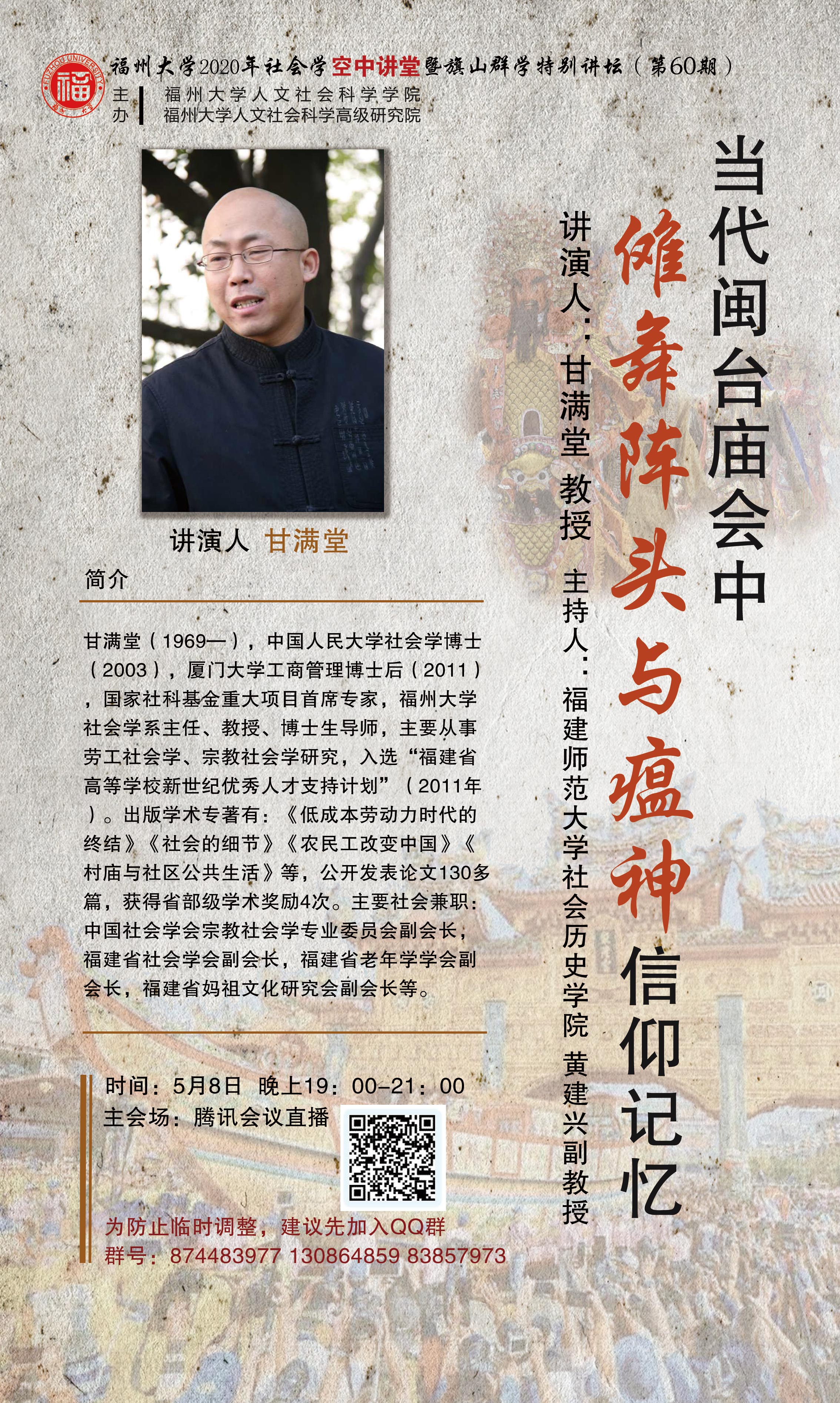 演讲人简介:甘满堂(1969—),中国人民大学社会学博士(2003),厦门大学工商管理博士后(2011),国家社科基金重大项目首席专家,87978797威尼斯社会学系主任、教授、博士生导师,主要从事劳工社会学、宗教社会学研究,入选“福建省高等学校新世纪优秀人才支持计划”(2011年)。出版学术专著有:《低成本劳动力时代的终结》《社会的细节》《农民工改变中国》《村庙与社区公共生活》等,公开发表论文130多篇,获得省部级学术奖励4次。